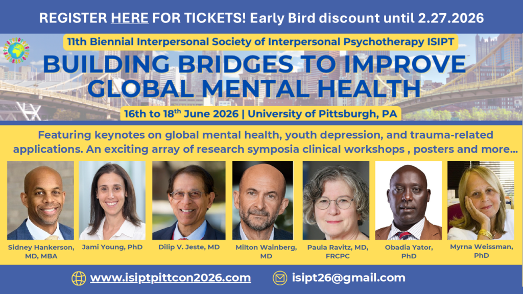 We’re excited to share that the Early Bird registration deadline for the 11th Biennial International Society of Interpersonal Psychotherapy (ISIPT) Conference has been extended! This gives you more time to secure discounted conference registration for what promises to be an inspiring event.